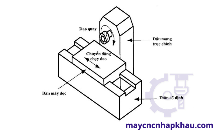 Máy có trục chính giống như máy phay ngang truyền thống. Nghĩa là được định hướng theo phương ngang, song song với bàn máy. Nói cách khác, máy gắn công cụ cắt trên trục quay định hướng theo chiều ngang.
